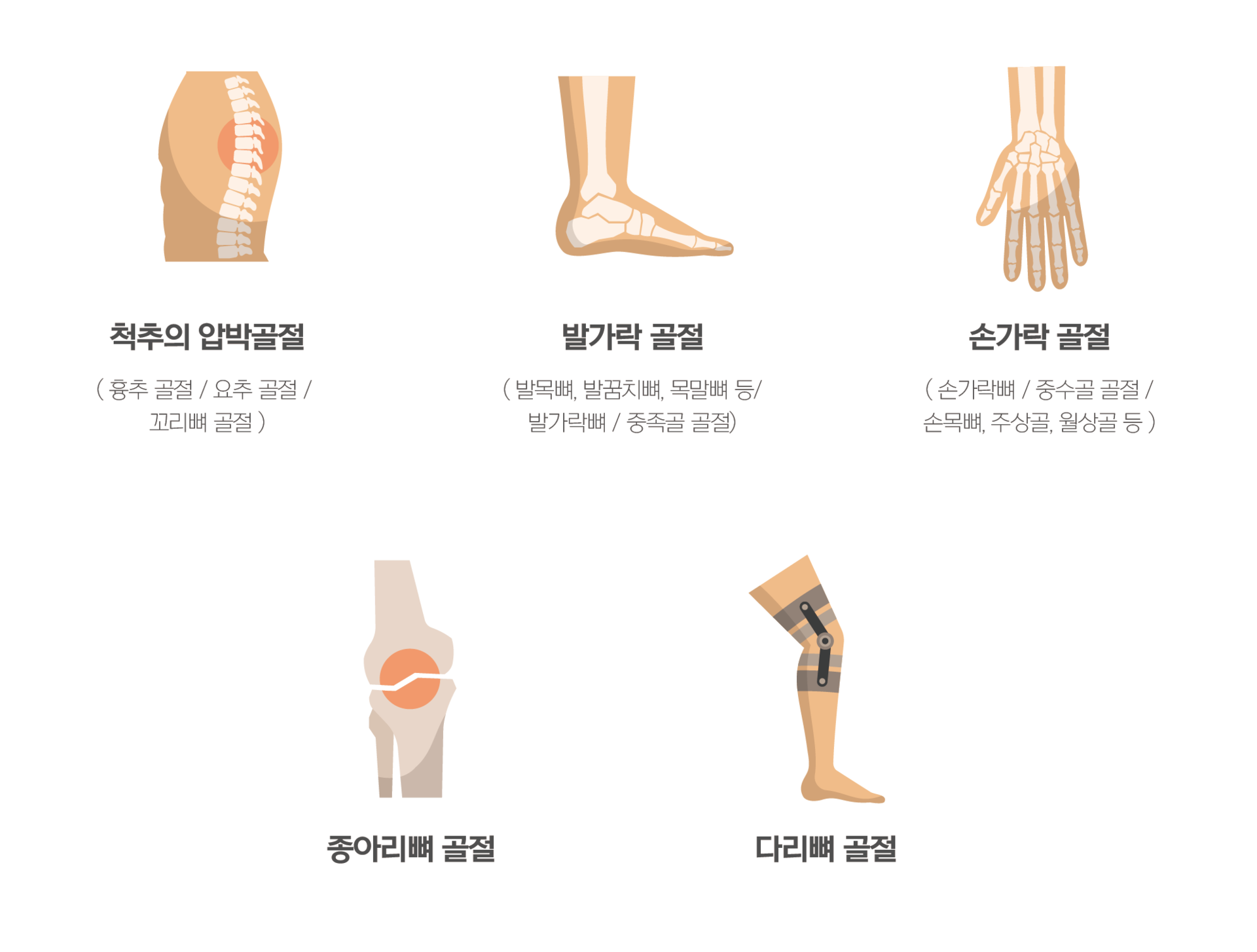 골절은 발가락, 발목, 손가락, 손목, 허벅지뼈, 종아리뼈, 고관절, 척추 및 꼬리뼈 등에 나타납니다.