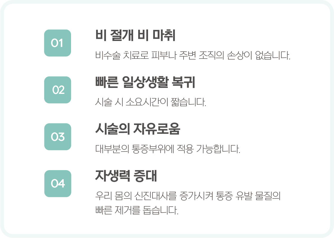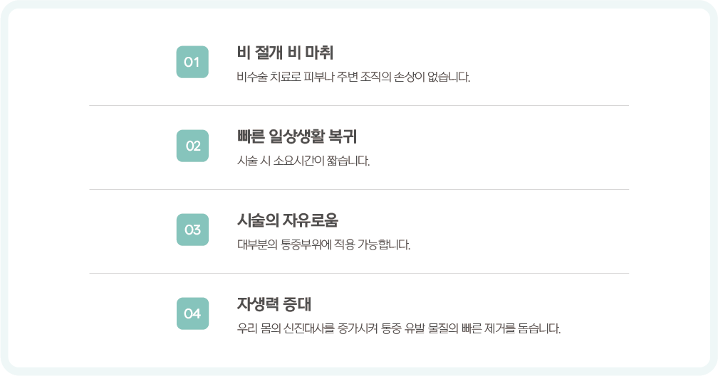 통증의 근본적인 원인 치료뿐만 아니라 관절 주위 조직과 뼈를 활성화시켜 통증감소 및 기능 개선을 얻을 수 있는 치료법입니다.